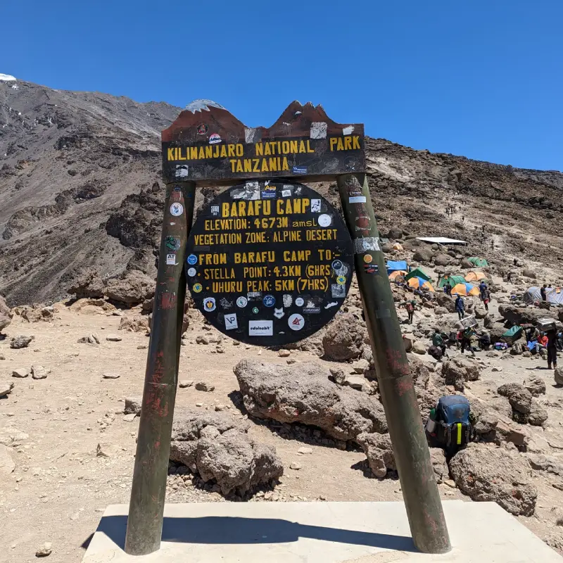 After breakfast, we leave Barranco and continue on a steep ridge up the Barranco Wall (elev 4250m/13,900ft), through the Karanga Valley (elev 4050m/13,250ft) to the junction which connects with the Mweka Trail. We continue up to the Barafu Camp. You have completed the South Circuit, which offers views of the summit from many different angles. Here we make camp with views of the summit in the distance.