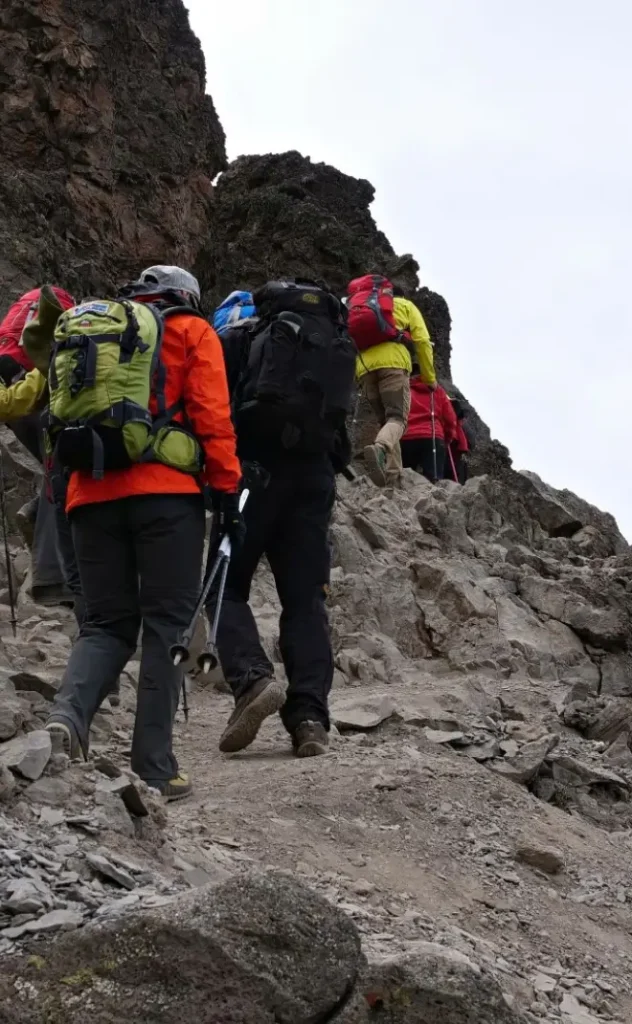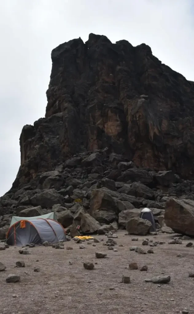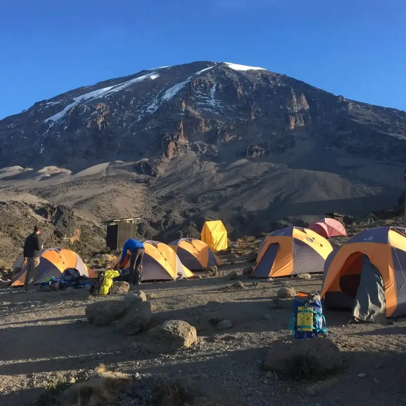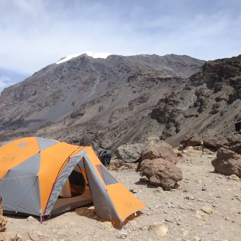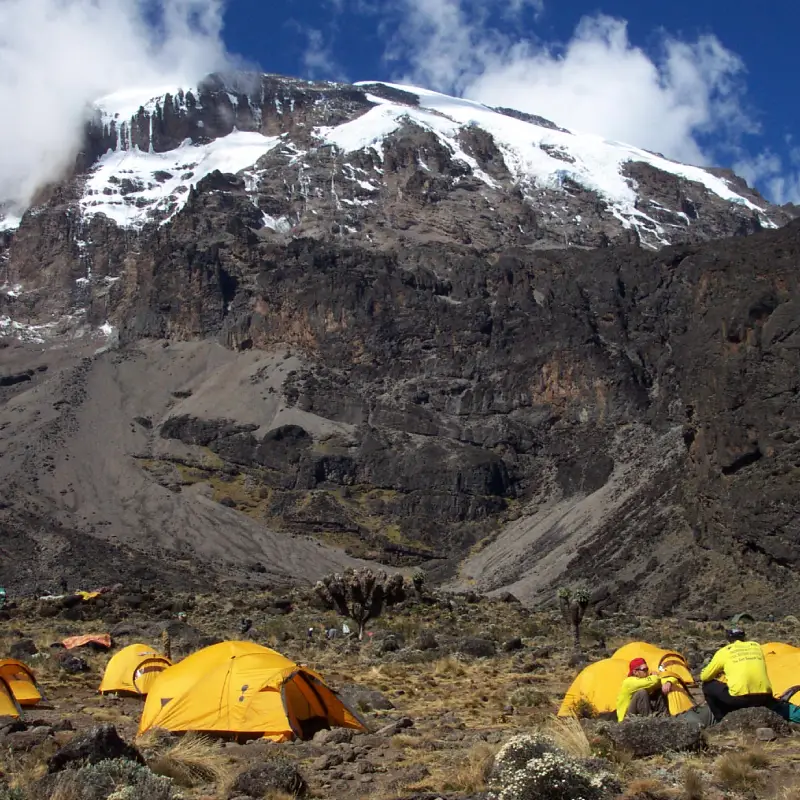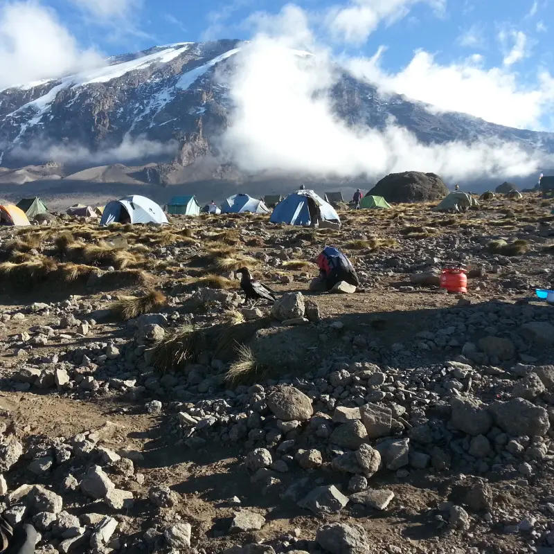Today’s adventure begins with a quick but enjoyable climb to the summit of the Great Barranco Wall. We next descend over scree to the Karanga Valley (3930m), which lies beneath the Heim, Kersten, and Decken Glaciers’ icefalls. We’ll spend the night in the Karanga camp.