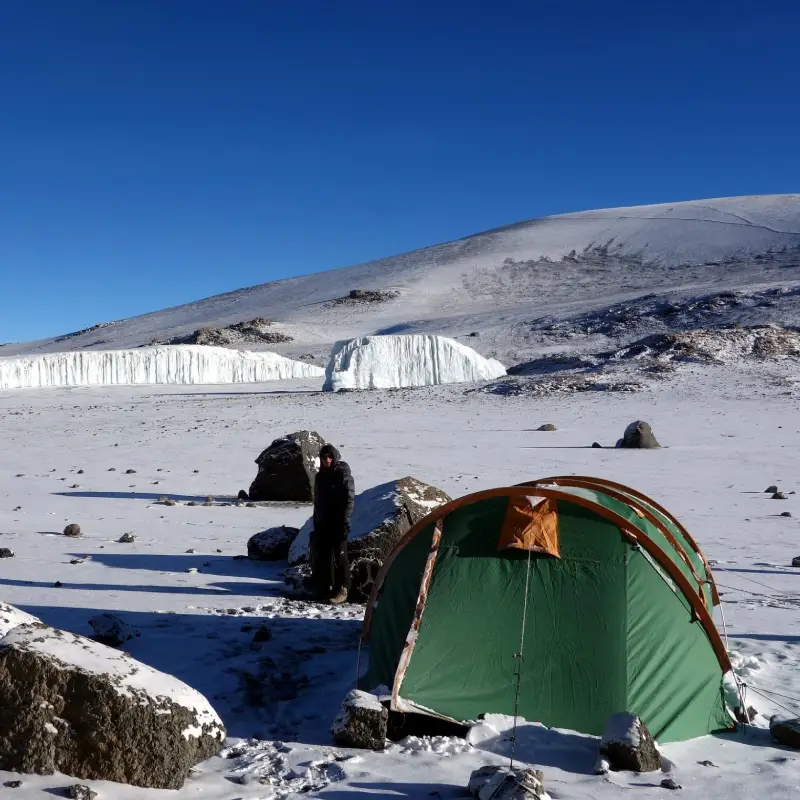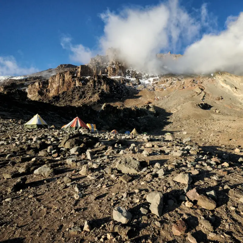 From the summit, we now make our descent continuing straight down to the Mweka Hut campsite, stopping at Barafu for lunch. Later in the evening, we enjoy our last dinner on the mountain and a well-earned sleep.