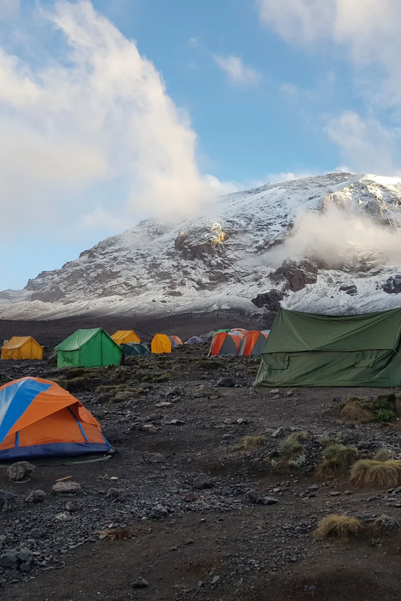Campsites on Mount Kilimanjaro vary depending on the route and service level. Generally, they are simple and functional, featuring tented accommodations set up at strategic altitudes to aid acclimatization. Basic campsites include standard tents with sleeping mats and minimal facilities, while higher-end options offer larger, more comfortable tents and additional amenities.