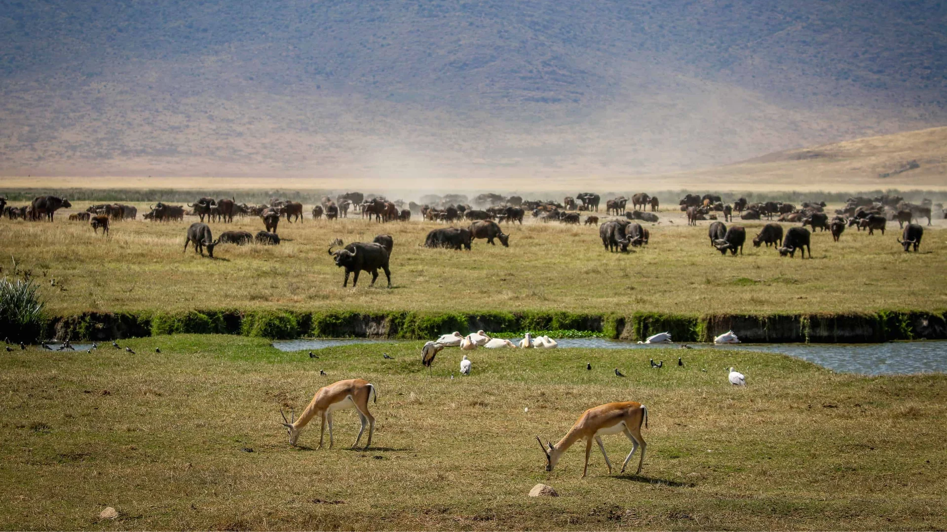A vast, unbroken volcanic caldera teeming with wildlife.